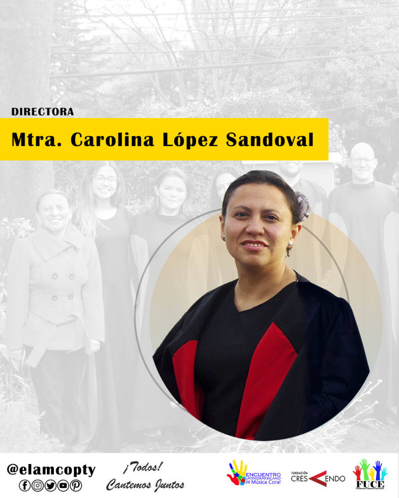 Mtra. Carolina López, inicio sus estudios musicales en Batuta, continuando en la Academia Musical La Escala con la Maestra María Beatriz de Calle, de donde fue directora asistente del coro que lleva su mismo nombre; posteriormente ingresa a la Universidad Pedagógica Nacional obteniendo el Titulo de Licenciada en Pedagogía Musical.